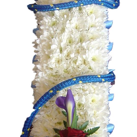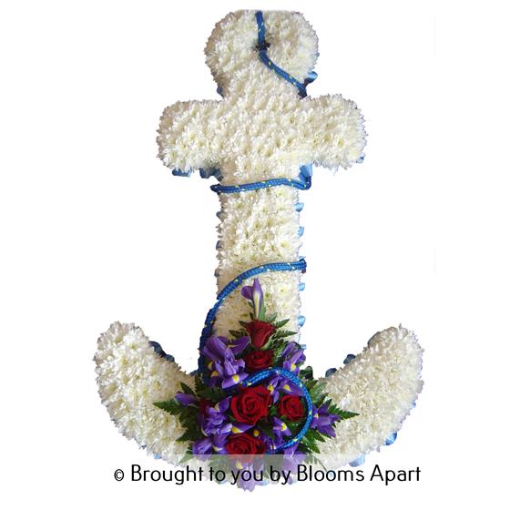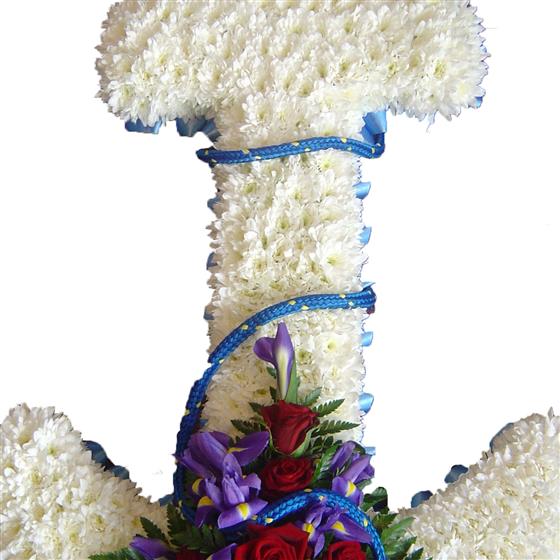 An anchor shaped design using a mass of white double spray chrysanthemums with a feature spray of red short Stem roses and a contrasting blue Irises. The tribute is finished with blue ribbon and a green cord.