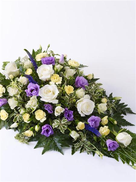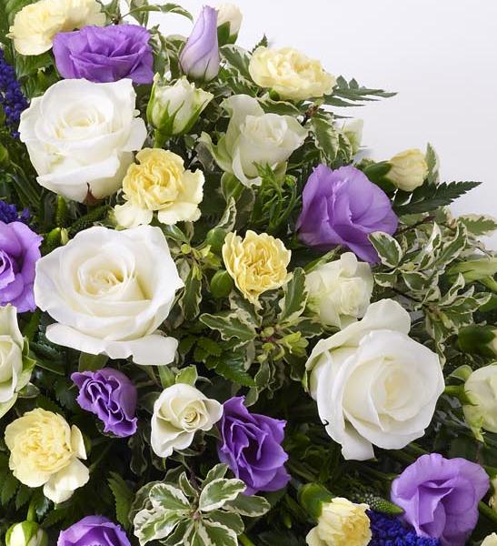 This beautiful floral spray features shades of blue, lilac, cream and white. Large-headed roses, lisianthus, spray carnations, spray roses and Veronica are carefully arranged with leather leaf and pittosporum.