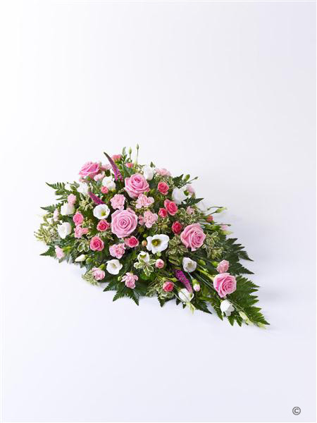 A beautiful tribute for a baby girl, this pretty pink spray features large-headed roses, spray carnations and spray roses in soft pink, interspersed with dark pink Veronica and delicate white lisianthus. It is finished with leather leaf and pittosporum.