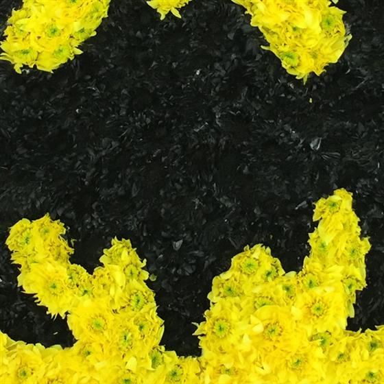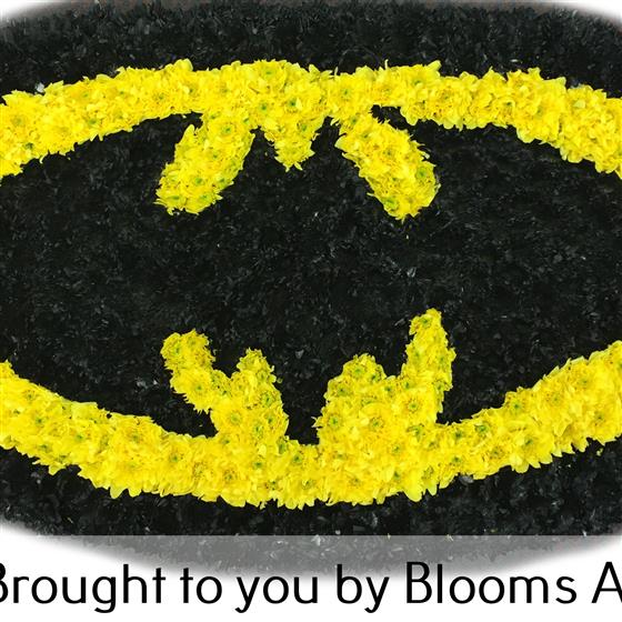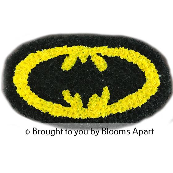 Batman Logo made with black dyed double chrysanthemums and yellow double chrysanthemums. Tribute size is 90cm x 60cm. (size can be modified).