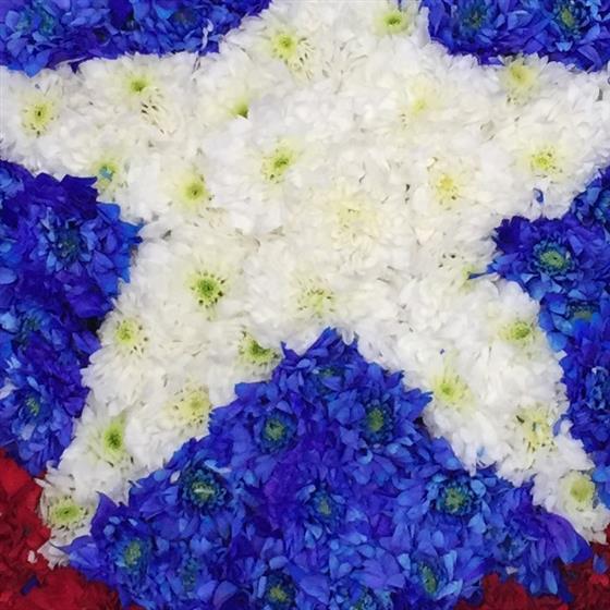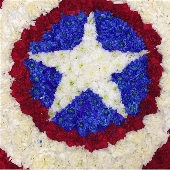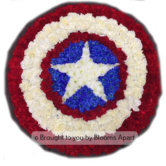 Captain America floral tribute shield made with Blue and Red double chrysanthemums.