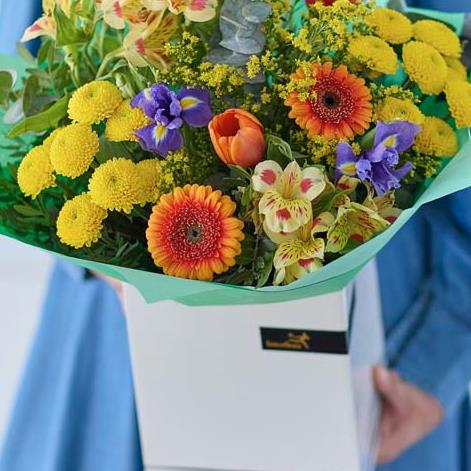 A handcrafted bouquet made by a local florist using the freshest blooms. This classic bouquet will feature flowers in vibrant shades inspired by spring. Think tangerine, cerise, chartreuse and ochre.