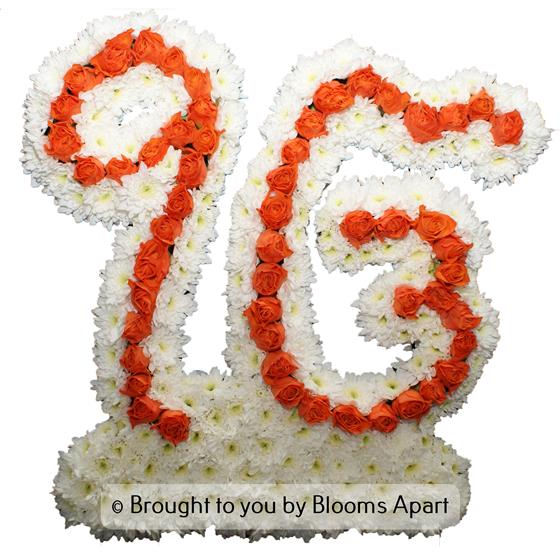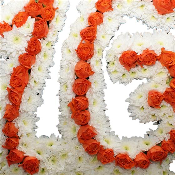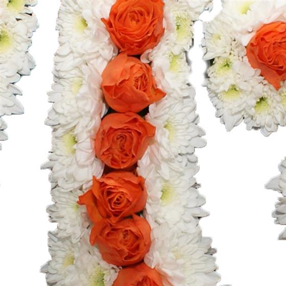 Ek Onkar Tribute massed with white chrysanthemums and in filled with orange roses.