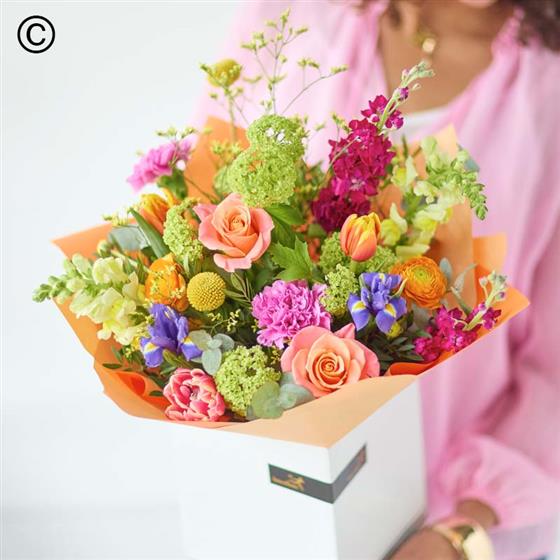 A handcrafted bouquet made by a local florist using the freshest blooms. This classic bouquet will feature flowers in vibrant shades inspired by spring. Think tangerine, cerise, chartreuse and ochre.