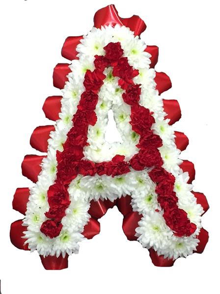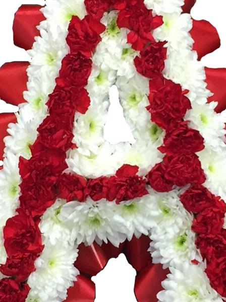 A tribute letter made using a mass of white double spray chrysanthemums highlighted with carnations, edged with coloured ribbon of choice, with feature sprays of roses to match ribbon.