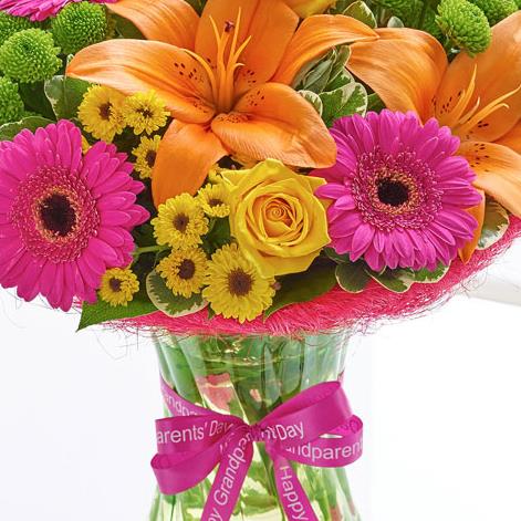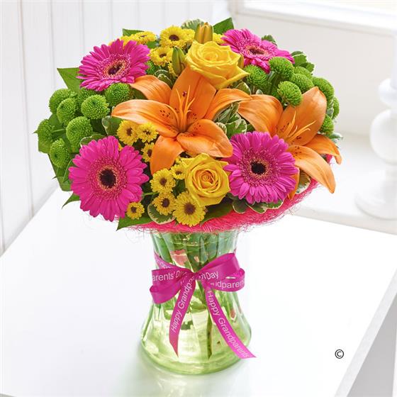 Featuring 4 cerise germini, 2 yellow large headed roses, 2 green spray chrysanthemums, an orange Asiatic lily and 2 yellow spray chrysanthemums with salal and pittosporum, presented in a lime swirl glass vase with cerise sisal collar, trimmed with a ‘Happy Grandparents’ Day’ ribbon and presented in Interflora gift packaging.