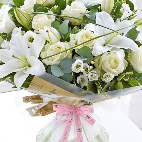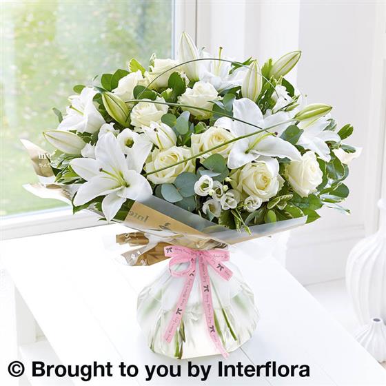 Featuring white large-headed roses, with white Oriental lilies and white lisianthus hand-tied with steel grass, salal, eucalyptus and pittosporum, wrapped and trimmed with 'Happy Mother's Day' ribbon and presented in Interflora Gift Packaging.
