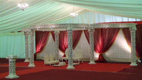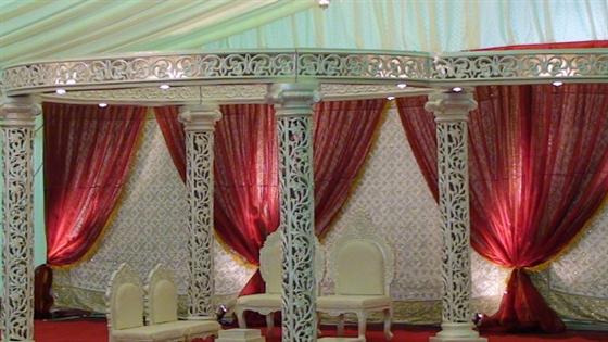 Six pillar round Mandap, with choice of backdrops, package includes welcome gate, walk way pillars with Ganesh or floral arrangement, Bride and Groom chair, two small chairs, priest stool and havan.