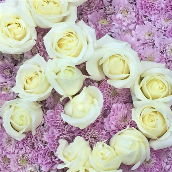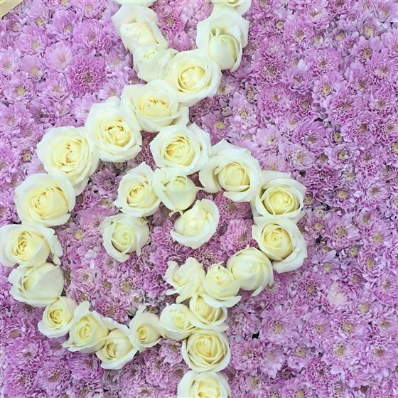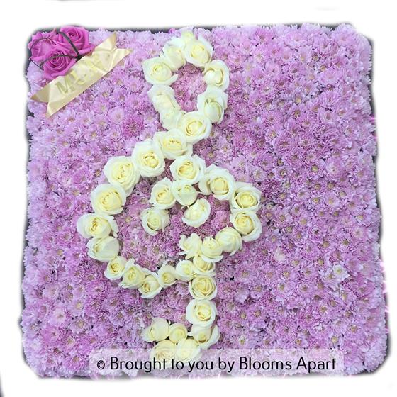 Musical Note Clef made with white roses on a pink board. Board size 60cm by 60cm