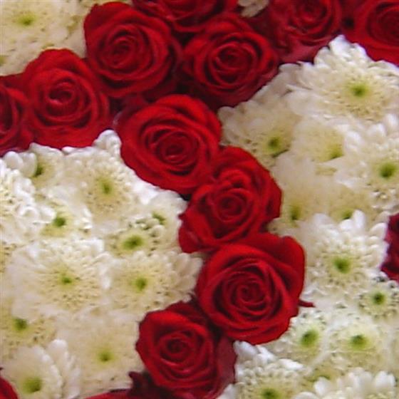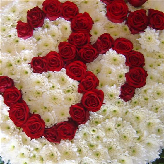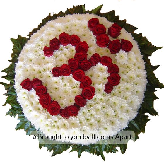 AUM on 18 inch posey pad, based with white chrysanthemums and infilled with red roses