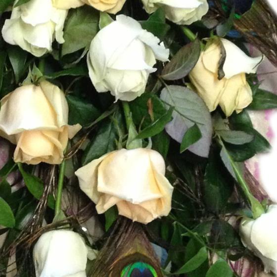 White & Peach Rose with Peacock feathers